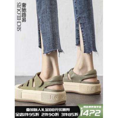 商品名称:奢驰路易(SECHILOUIS)包头凉鞋女2023夏季新款皮复古罗马鞋透气镂空洞洞休闲板鞋女 绿色 36